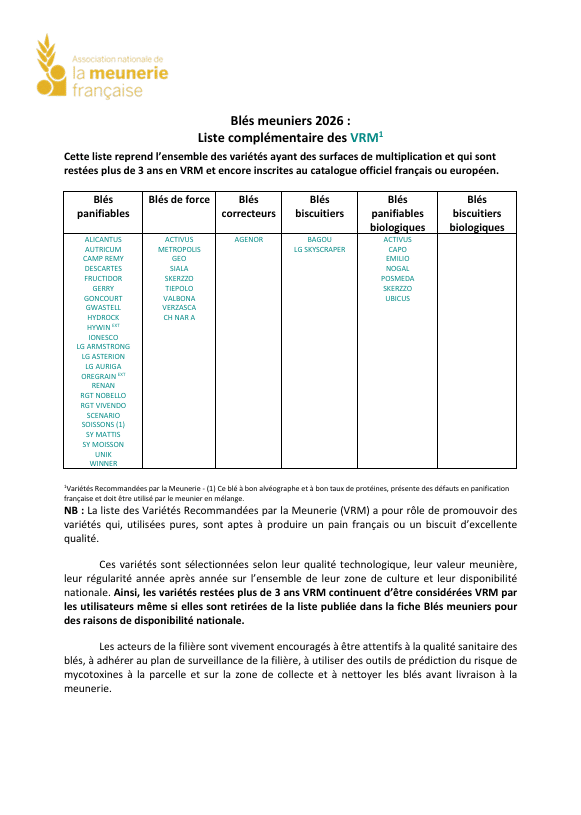 Les listes de variétés de ce document sont des listes positives : toute variété qui n’apparait pas dans la liste est de fait exclue des mélanges meuniers et entraine le déclassement du lot complet.